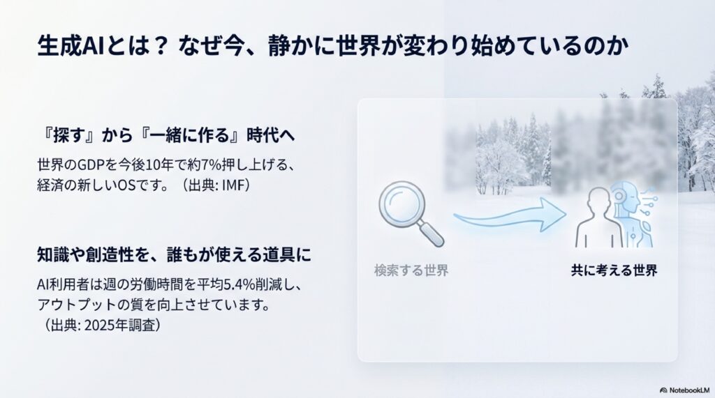 今、世界は「検索する時代」から、AIと「共に考える時代」へと大きく変わり始めています。AIを活用することで、週の労働時間を平均5.4%も削減できるというデータもあるんです。まさに、現代の新しいOSと言えますね!