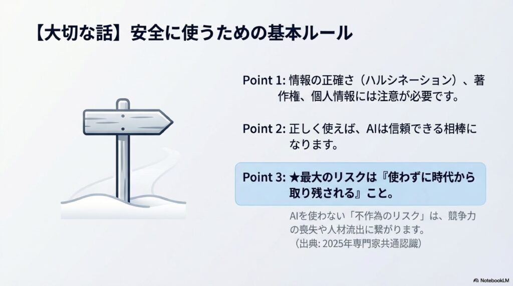 AIを「信頼できる相棒」にするために、いくつか大切なポイントがあります。情報の正確さ(ハルシネーション)や個人情報の取り扱いには注意しましょう。でも、一番のリスクは「使わずに時代から取り残されること」。まずは怖がらずに、一歩踏み出すことが大切です!