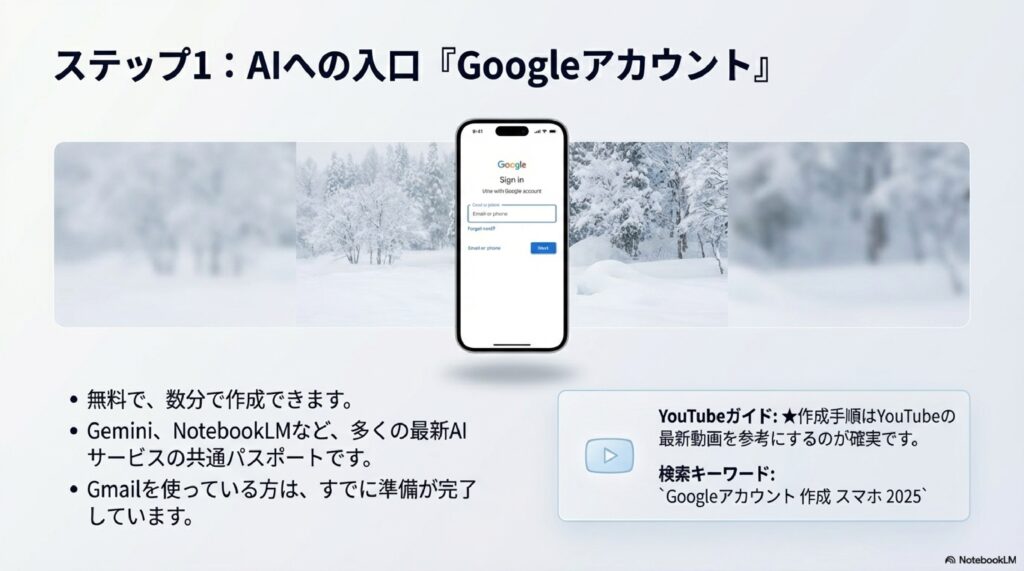 まずはGoogleアカウントをパスポート代わりに、AIの世界へ飛び込みましょう!