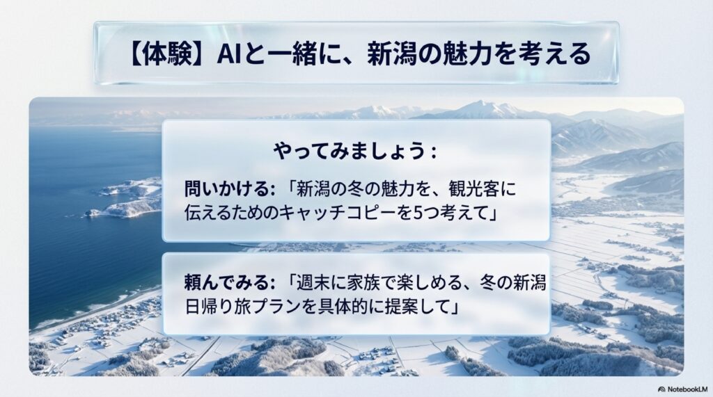 - Gemini(ジェミニ):まずは会話から!「新潟の冬の魅力を伝えるキャッチコピーを考えて」と話しかけてみてください。