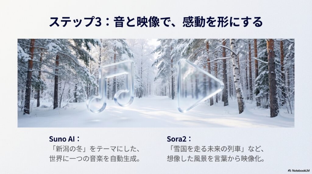 - Suno AI:「冬の日本海、ジャズ」といったキーワードで、世界に一つだけの歌が作れます。