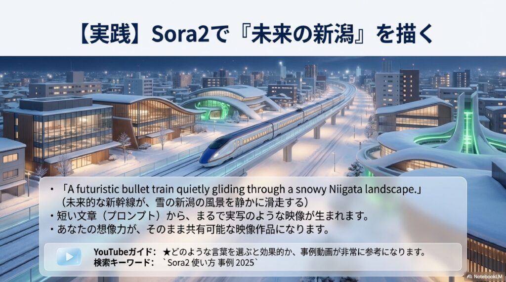 - Sora2:「雪国を走る未来の列車」など、あなたの想像をそのまま映像化できます!
