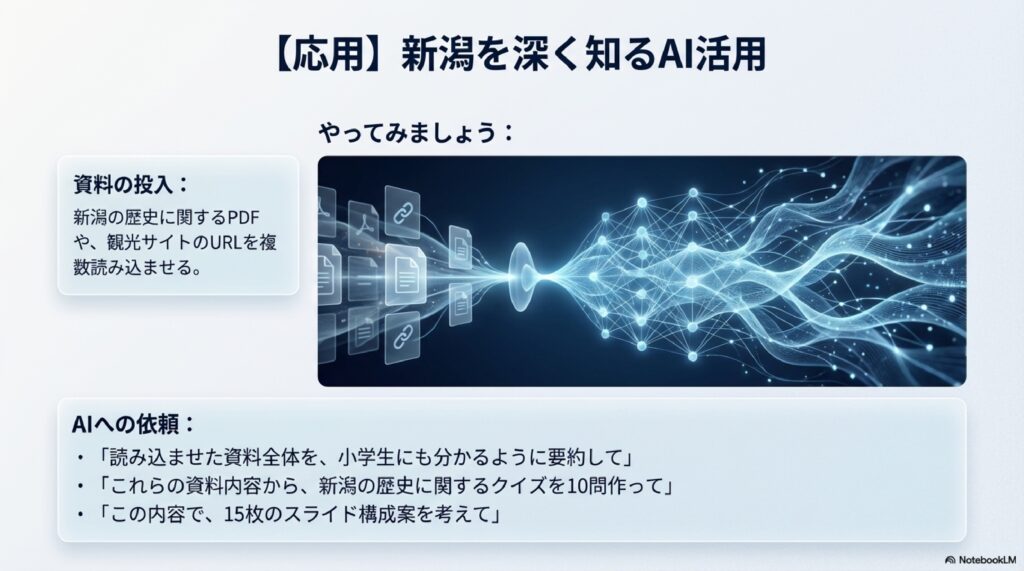 中級編としておすすめなのがNotebookLM。自分の手元にあるPDFやWebサイトを読み込ませるだけで、その情報だけを根拠に答えてくれる「自分専用AI」が作れます。新潟の歴史資料を読み込ませれば、あっという間に「新潟専門家AI」の誕生です!