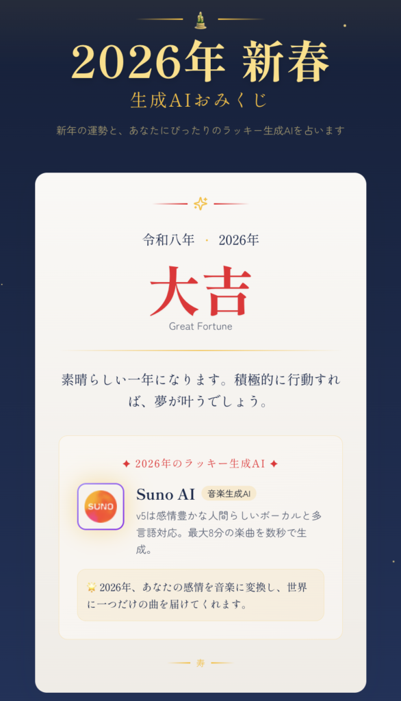 最先端のAIが、あなたの2026年の運勢を占ってくれる…かもしれません!大吉が出るか、それとも…!?さあ、新年最初の運試し、行ってみましょう!👇