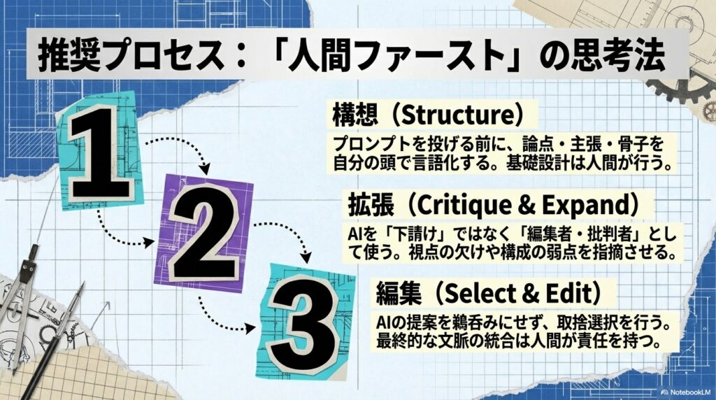 ポイントは、AIを「執筆者」ではなく「厳しい編集者」や「アイデアの壁打ち相手」として扱うことです。